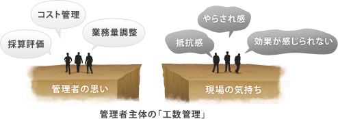しかし、管理者が主体となって行う「工数管理」の場合、現場との間に次のような温度差を生むことがあります。