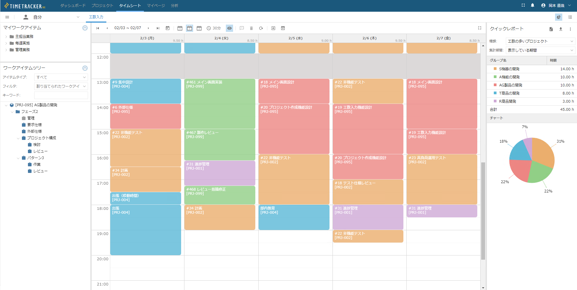 TimeTracker NXでは、「タイムシート」という機能で工数を入力します。「タイムシート」は予定表のような見た目なので、「何に、誰が、どれだけ工数をかけたのか」だけでなく、「いつ」という時間軸も合わせて見ることができます。それによって、単純な個々の作業の時間だけでなく、どのような順番・タイミングで作業をしているのかが見え、個人個人の日々の仕事ぶりまでも見える「時間日誌」にもなるのです。