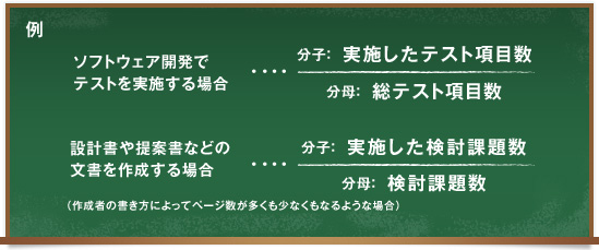 進捗率には分母と分子があるわけですが、分母が揺れ動いてしまうようでは意味のない指標になってしまいますから、変わりにくい分母を選ぶことがポイントになります。単純な繰り返しの作業などで、アウトプットする成果物の成果量が明確に見積もれる場合には、進捗率を計算で求めればよいでしょう。