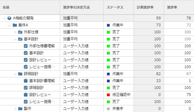 下位のアイテムを規模(工数)で重みづけし、進捗率の平均値を自動的に計算します。WBSが十分に詳細化されていれば、標準の設定でもある程度正確な進捗率を求めることができます。