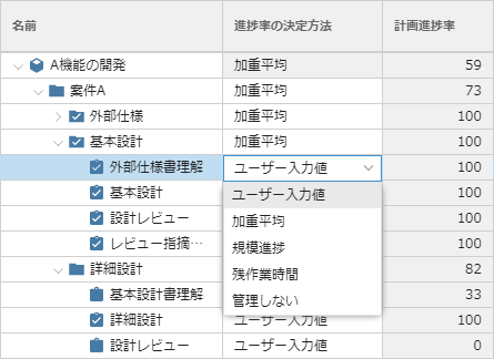進捗率の決定方法は、タスクやタスクパッケージの単位で個別に変更できるようになっています。