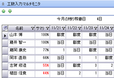 「定着モニタ」は、「誰もが毎日工数を入力できる。工数入力が定着する。」をコンセプトとして、高精度な工数入力の風土醸成を支援するために搭載された仕組みです。各メンバーの工数入力状況が見える化され、自然に日々の工数入力忘れ防止やタイムリーな工数入力が促進されます。