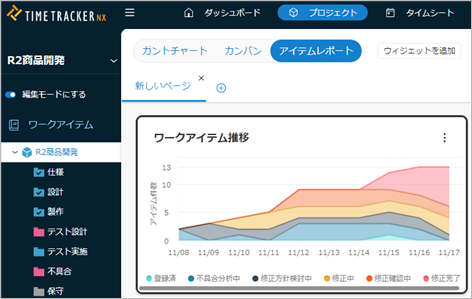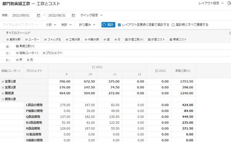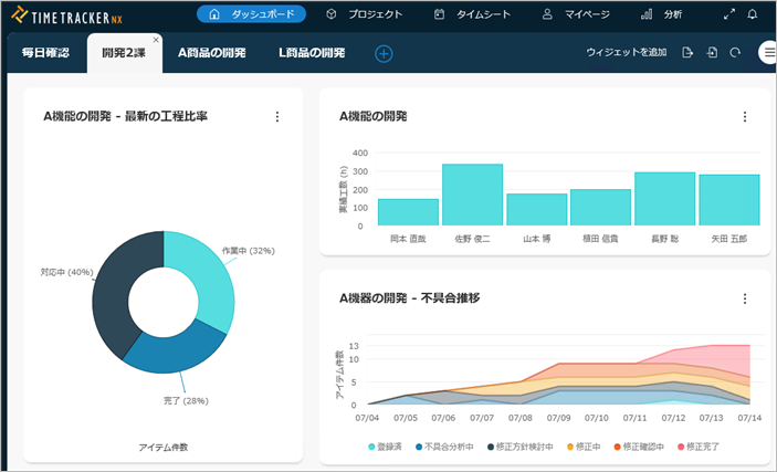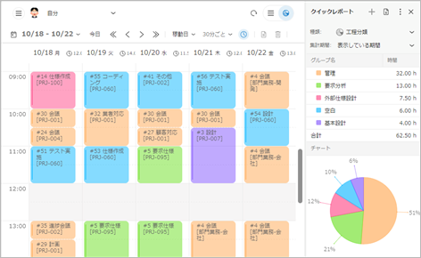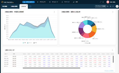 プロジェクトメンバーの視点から、マネージャの視点から、あるいは上級管理者の視点から工数や進捗のデータを見える化し、分析します。