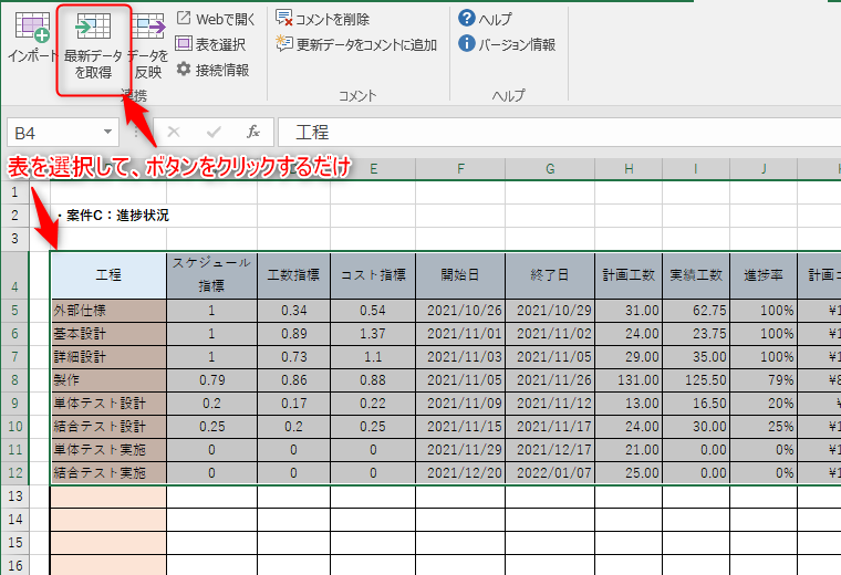 進捗の会議などで、Excelの報告書の進捗や割り当てを直接編集したとしましょう。