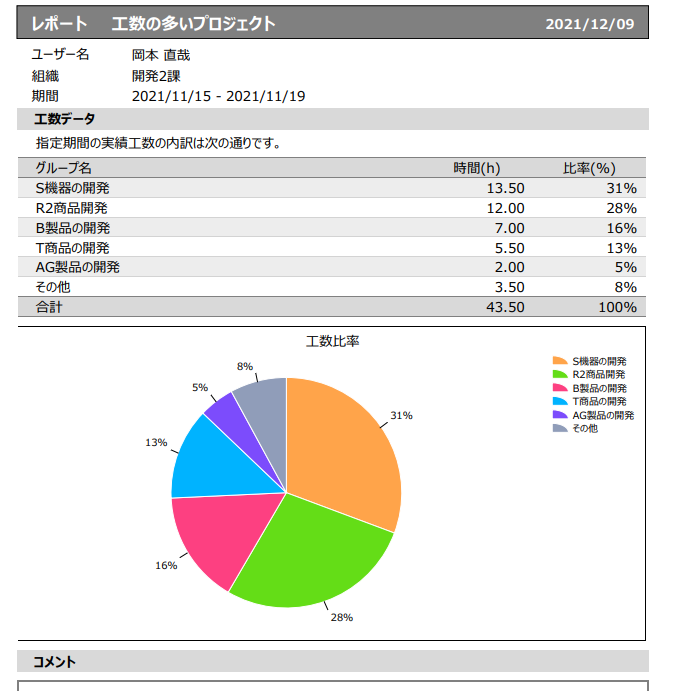 TimeTrackerなら、個人の日々の実績工数もPDF形式のレポートで作成できるので、Excelで集計したりわざわざ報告書を作成する必要がありません。