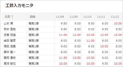 メンバの入力状況が一目でわかり、入力状況を常に確認できるので早めにフォローができ、工数入力忘れの防止やタイムリーな入力を促進します。 -