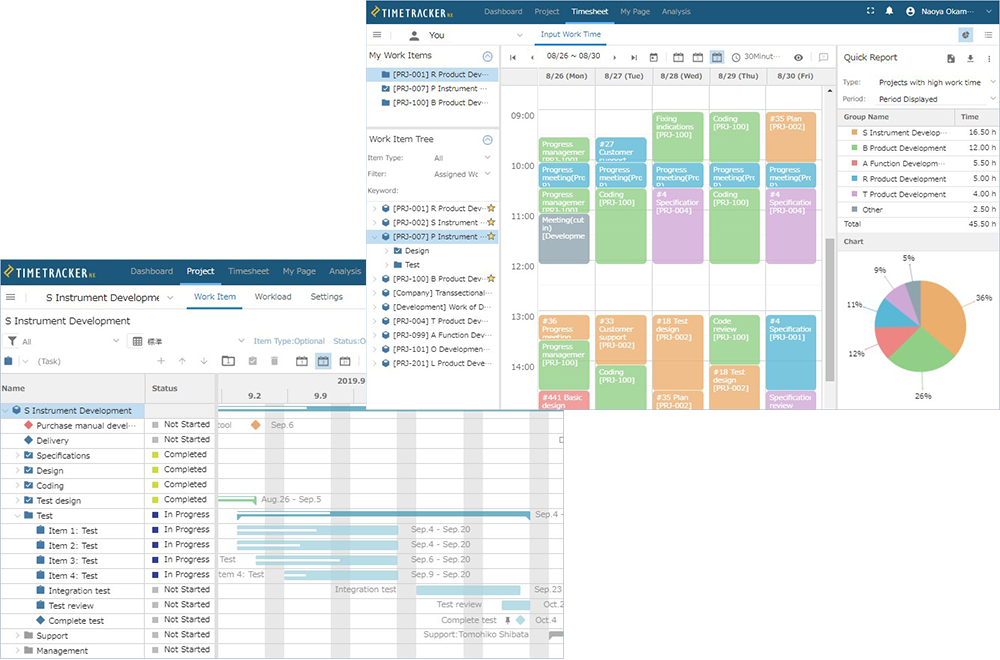 プロジェクトを構成するワークアイテムについて、従来の「タスク」「パッケージ」に加えて任意のアイテムタイプが追加できるようになりました。「課題」「不具合」や「要求」などプロジェクトの内容に合わせてフィールドやステータスを設定することで、チケットのように管理できます。課題管理や不具合管理と、TimeTracker NXならではの高精度の工数管理が統合されることで、プロジェクト活動全般の管理ツールとして進化しました。