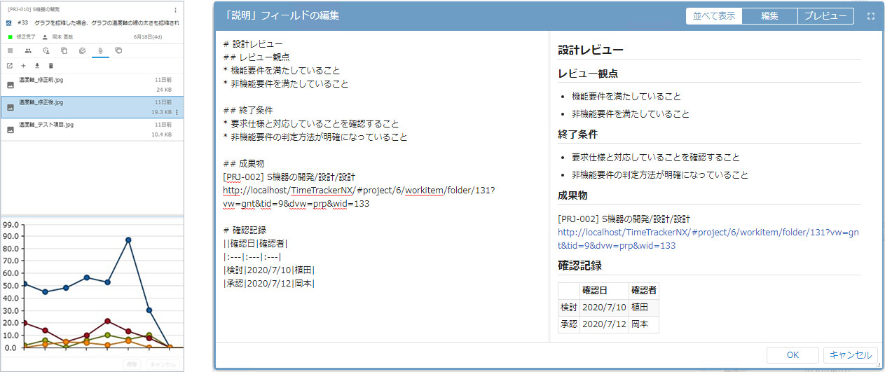 新しいTimeTracker NXでは、Markdown形式により見出し、表、図を表現できるようになりました。もちろん、URL表記はハイパーリンクになります。加えて、ファイルを添付することもできます。