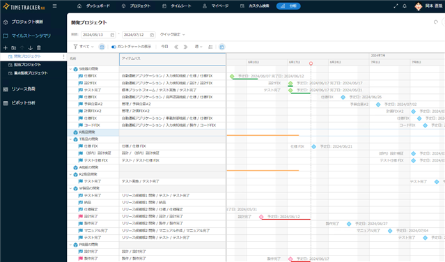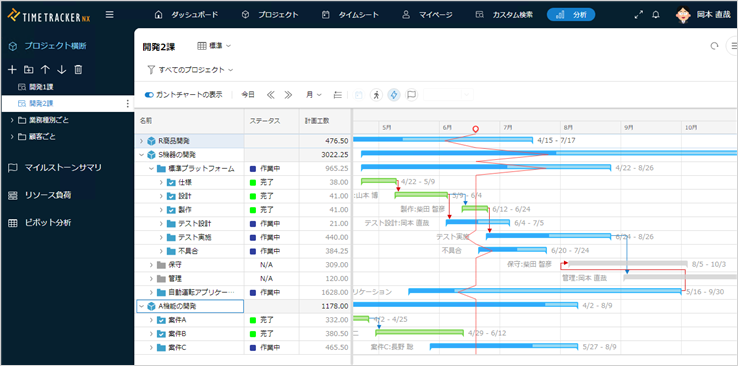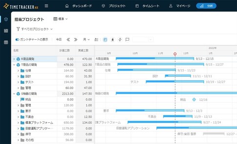 TimeTracker NXでは、複数プロジェクトのガントチャートが1つの画面上に表示されるので、プロジェクトを跨いだ計画や進捗状況を視覚的にすぐ把握できます。