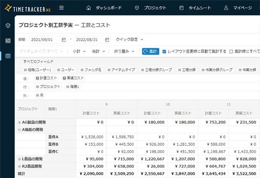 「ピボット分析」では、工数だけでなくコストも自在に集計可能。
