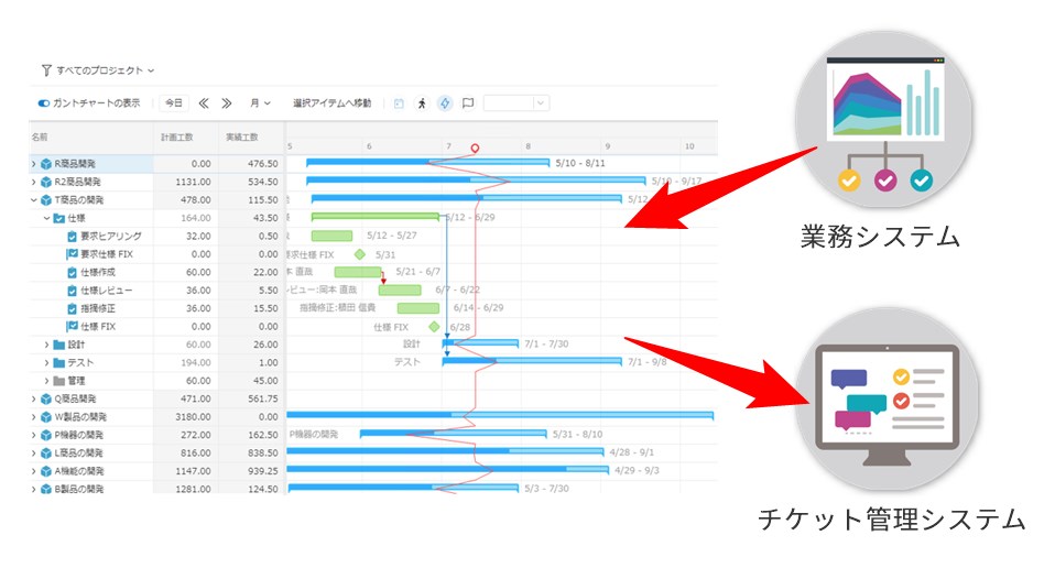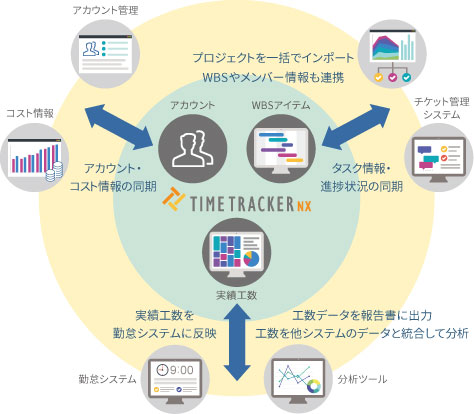・TimeTracker NXで管理している工数やプロジェクトの情報を他のチケット管理ツールや業務システムと同期する。