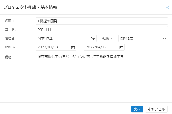 「プロジェクト作成 ‐ 基本情報」ダイアログで、プロジェクト情報を入力する。