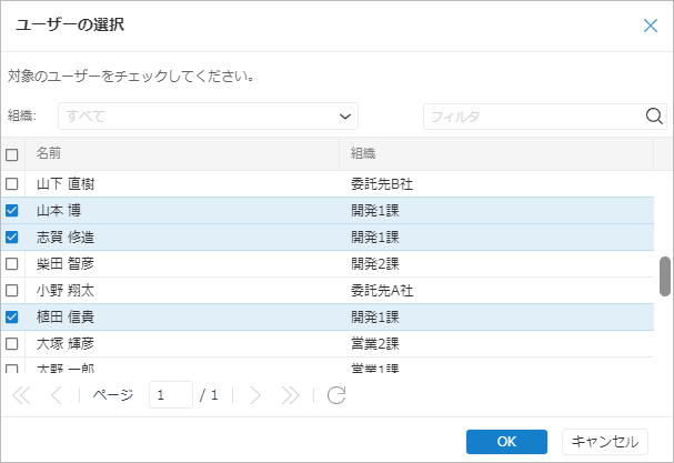 - 「ユーザーの選択」ダイアログで、対象とするユーザーをチェックする。