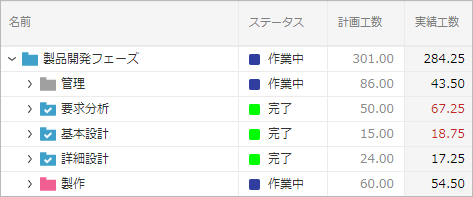 例えば、実績工数が計画工数を上回った場合、実績工数が赤字で表示されます。