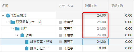 タスクに設定した計画工数は、WBSの上位階層にも自動的に積み上げて反映されます。