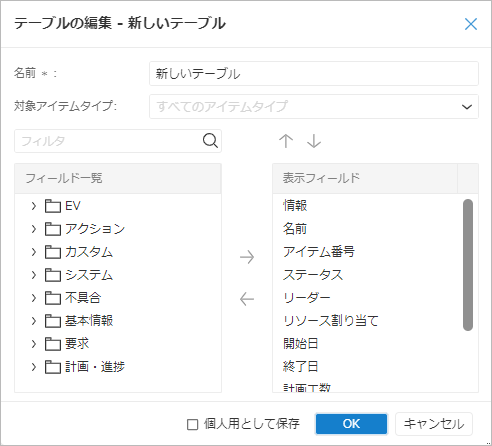 表示するフィールドから削除する場合は、「表示フィールド」から削除するフィールドを選択し「←」をクリックする。 - 「OK」ボタンをクリックする。