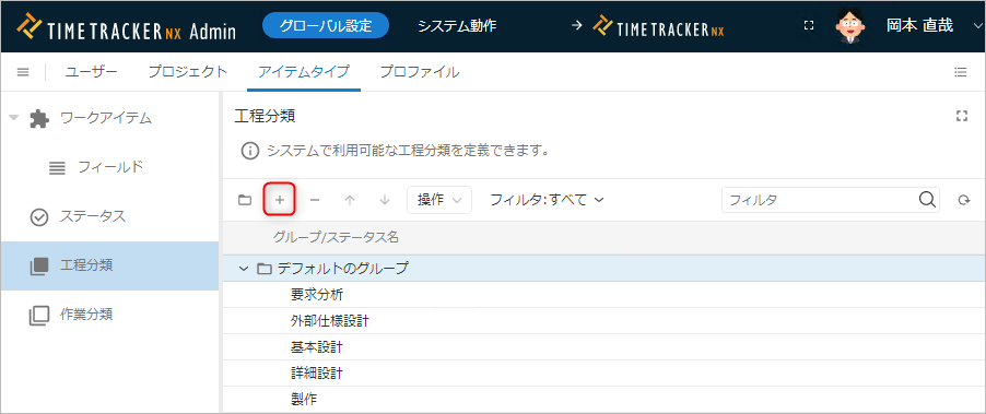 工程分類一覧の上部にある「+」アイコンをクリックする。
