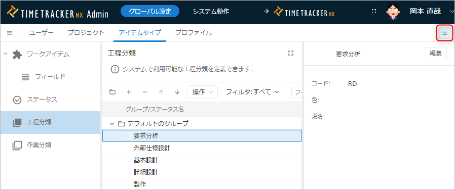 追加した工程分類は、プロジェクトの設定において利用可能にすることができます。