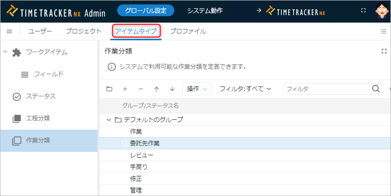 追加した作業分類は、プロジェクトの設定において利用可能にすることができます。