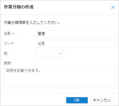 「作業分類の作成」ダイアログで作業分類の情報を入力する。