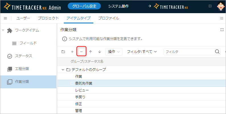 - 作業分類一覧の上部にある「-」アイコンをクリックする。