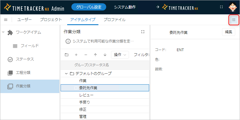作業分類の表示順は、ここでの設定がすべてのプロジェクトに反映されます。