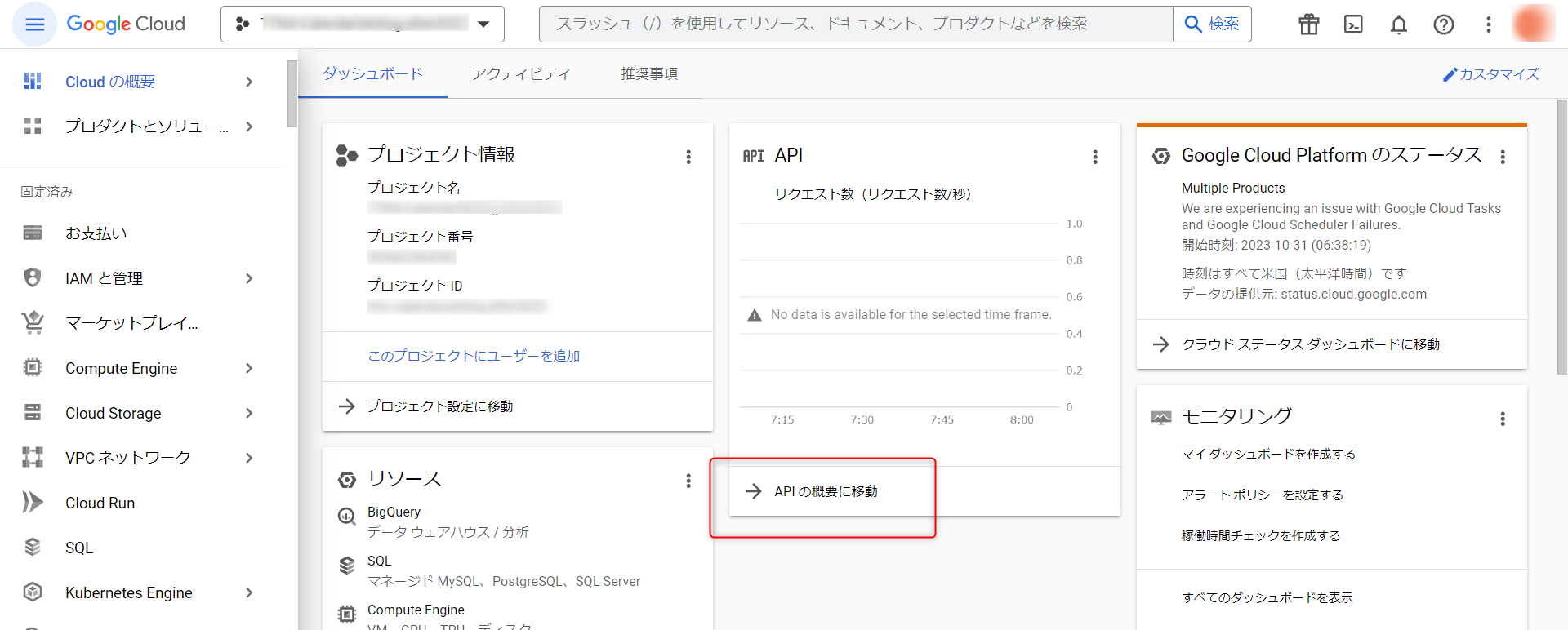 ダッシュボードの「APIの概要に移動」をクリックし、移動先の画面で「APIとサービスを有効化」をクリックする。