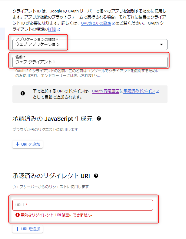 アプリケーションの種類で「ウェブアプリケーション」を選択して、以下を設定後に「作成」ボタンをクリックする。