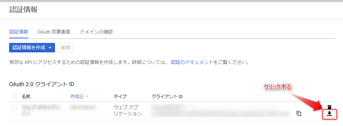 OAuth2.0 クライアントID 一覧の download ボタンをクリックし、