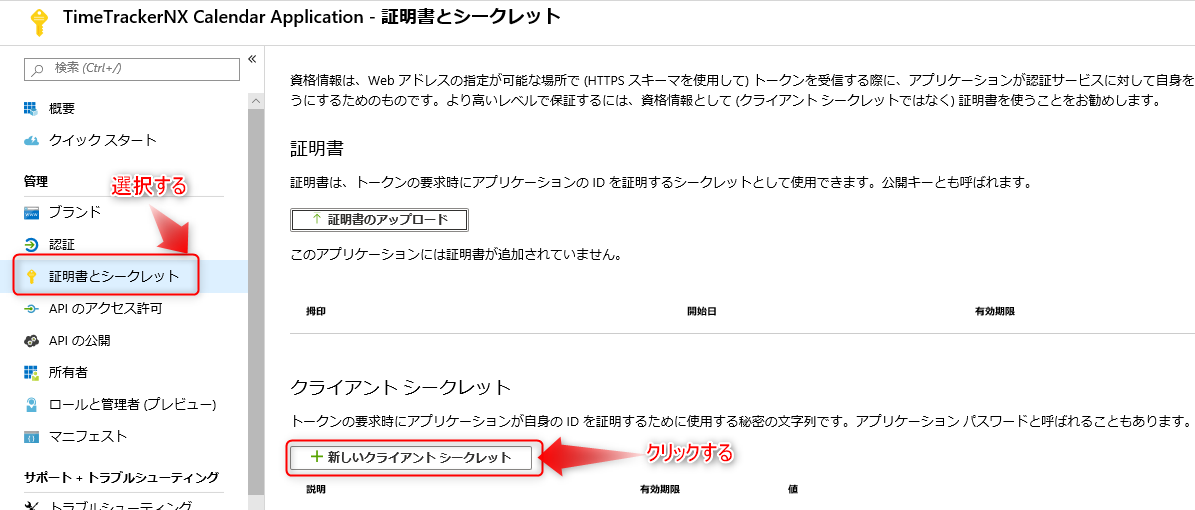 「管理」→「証明書とシークレット」を選択し、「新しいクライアントシークレット」を