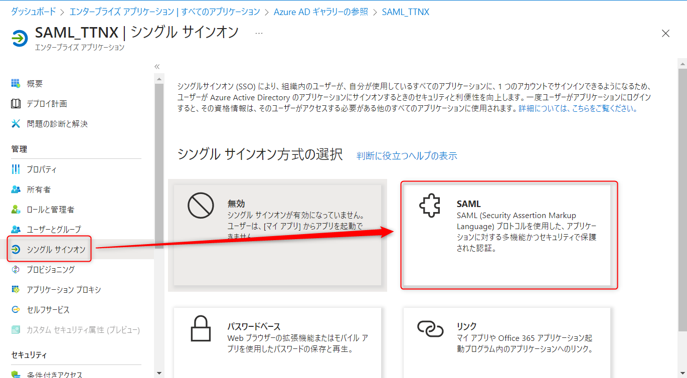 遷移後の画面で「SAML ベースのサインオン」をクリックして画面を移動してください。
