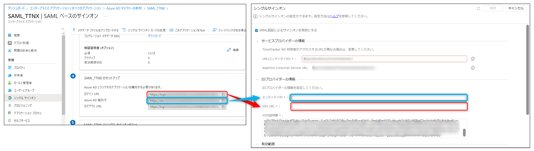 TimeTracker NX に貼り付けてください。Microsoft Azure AD の項目 TimeTracker NX の項目 ログインURL SSO URL Azure AD 識別子 エンティティID
