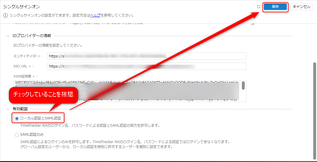 TimeTracker の設定画面で「有効範囲」が"ローカル認証とSAML認証" にチェックが入っていることを確認し、