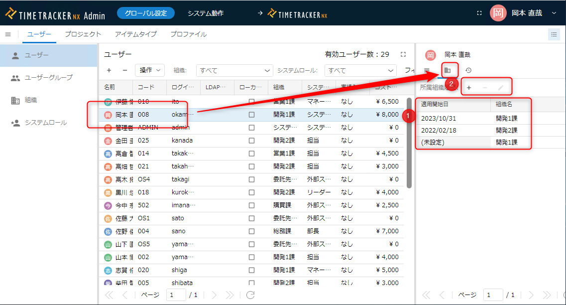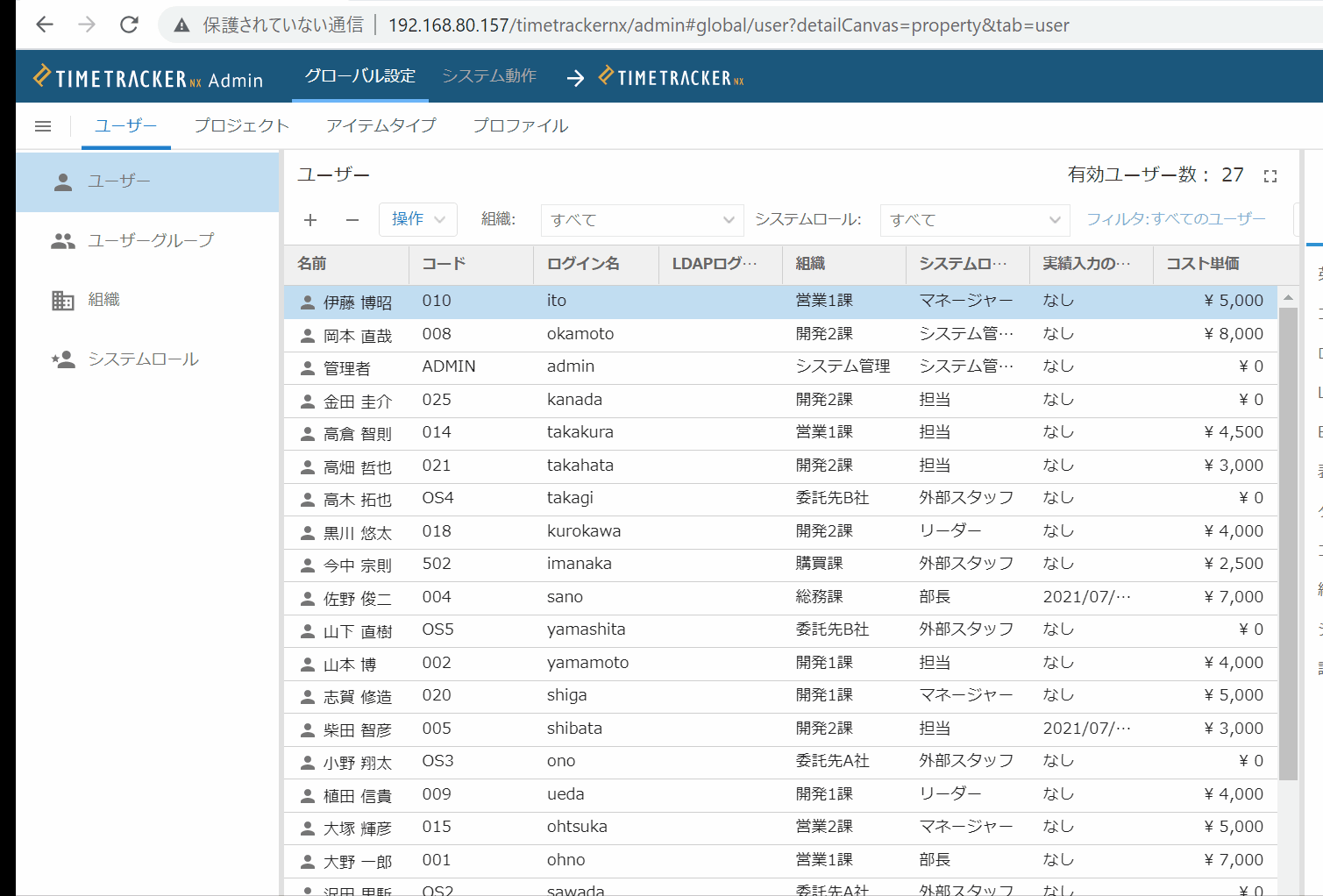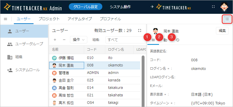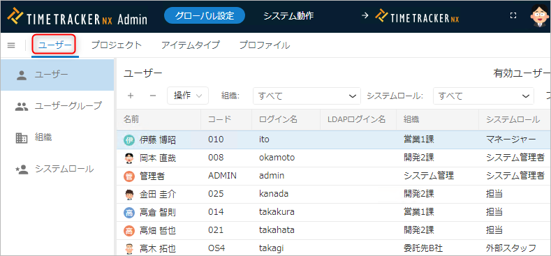 No. 項目 説明 用途 1 名前 ユーザーの名前 ユーザー選択時のフィルタ 2 英語表記名 ユーザーの名前(英語) ユーザー選択時のフィルタ 3 コード ユーザーを識別するコード ユーザーの検索 4 ログイン名 TimeTracker NX のログイン名 ログイン時に入力 5 パスワード TimeTracker NX のパスワード ログイン時に入力 6 組織 ユーザーが所属する組織 権限や集計の範囲、ユーザーの検索など 7 システムロール ユーザーに割り当てるシステムロール名 対象ユーザーに対する権限の付与