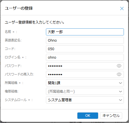 「ユーザーの登録」ダイアログでユーザー情報を入力し、「OK」ボタンをクリックする。