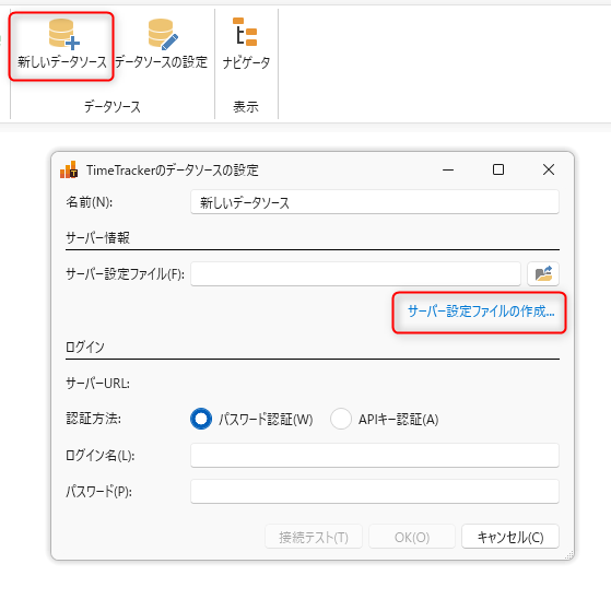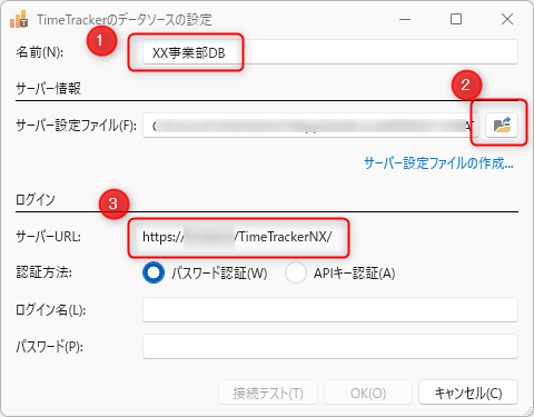 サーバー設定ファイルを指定すると、③に接続対象の TimeTracker NX の URL が表示されます。