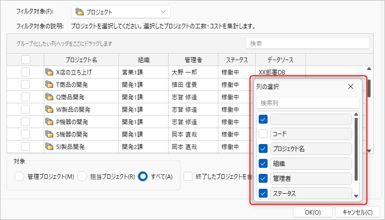 表示された「列の選択」ダイアログで列の表示、非表示を切り替えることができます。