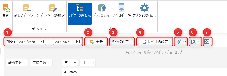 | ⑦ | 分析レポートを最大化します。 | 以下のどちらかの操作で元のサイズに戻ります。 - 「F11」ボタンをクリックする。 - 以下のボタンをクリックする ![]() |
