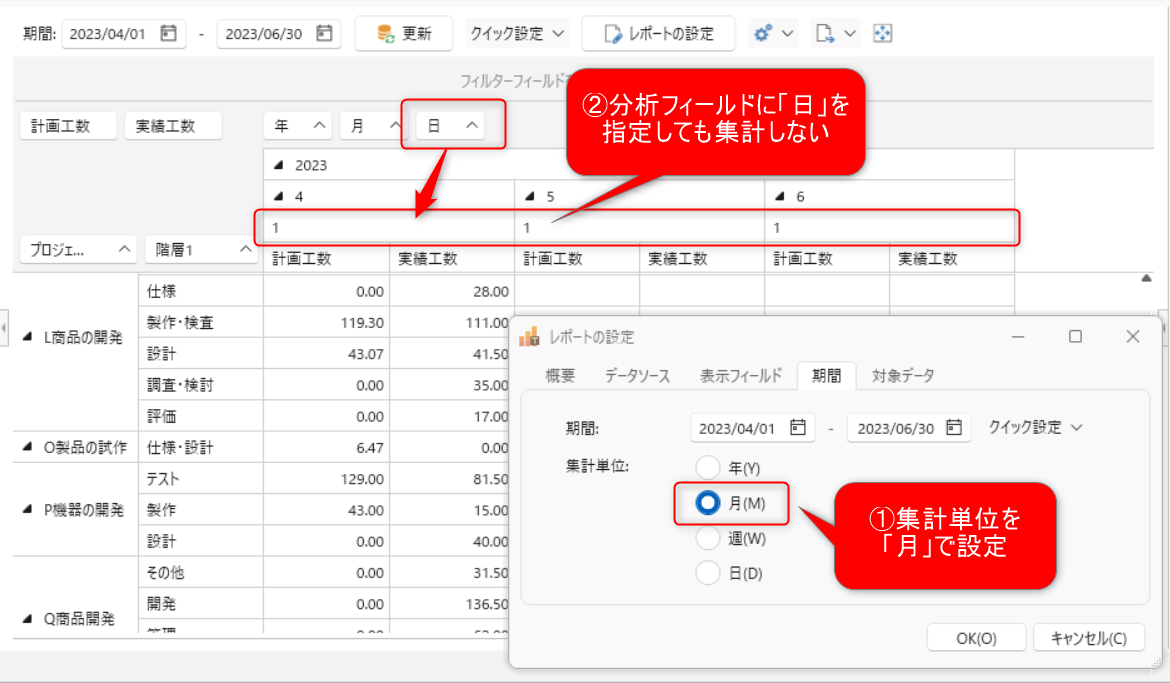 下図のケースで「日」単位で集計したい場合は、集計単位を「日」に変更してください。