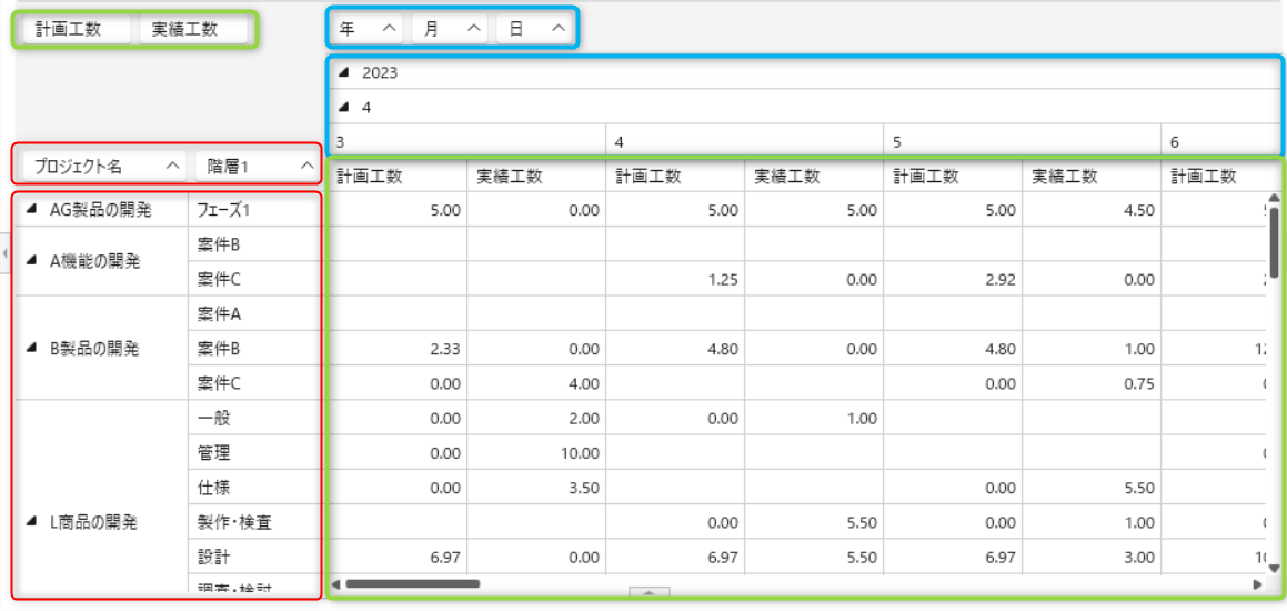 分析ビューは下図のように、行(赤色)、列(水色)、値(黄緑色)で指定したフィールドの値を集計します。