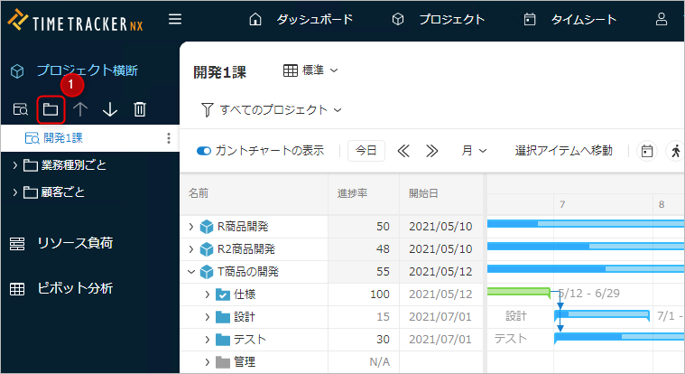 「追加」アイコン②で、対象のプロジェクトを追加する。