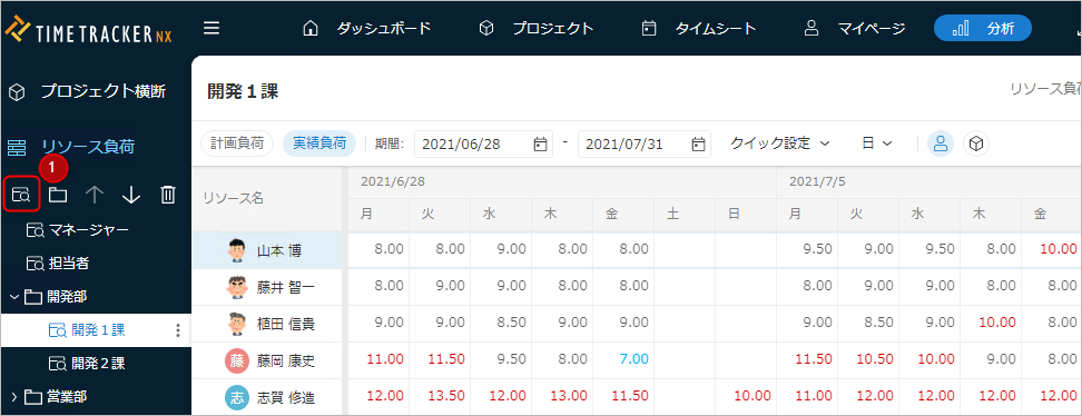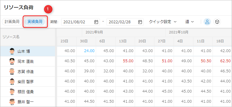 各メンバーの実績の負荷(実績工数)を確認することができます。