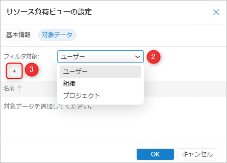 「リソース負荷ビューの設定」ダイアログの「対象データ」タブをクリックする。