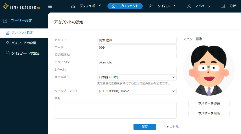基本操作ユーザー設定を変更するこのページの見出しユーザー設定を変更する概要 TimeTracker NX でユーザー毎の設定する内容をご紹介します。 アカウントの情報を変更する ユーザーが変更可能なユーザー情報について、変更方法や権限による制約を紹介します。 グローバルナビに表示されているログイン名をクリックする。 表示されたメニューから「ユーザー設定」を選択する。 左側のメニューから「アカウント設定」を選択する。 変更したい項目について、内容を編集もしくはプルダウンメニューから選択する。 「保存」ボタンをクリックし、変更内容を保存する。 アカウント情報