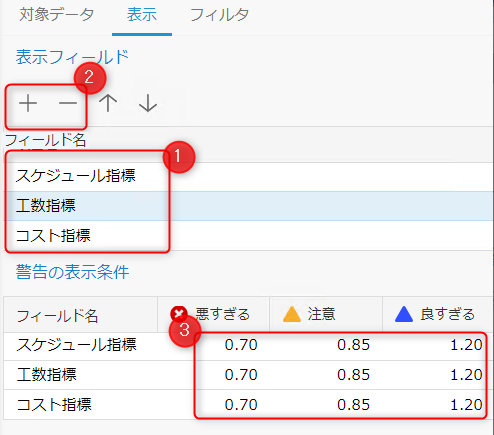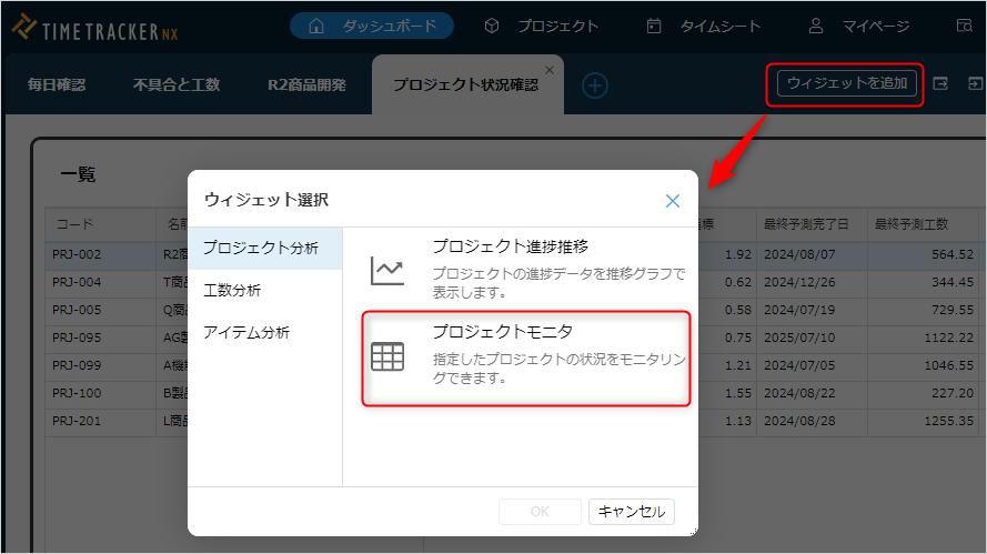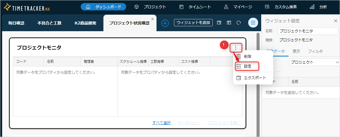 以下の方法でプロジェクトモニタウィジェットに表示する内容を設定します。
