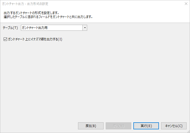 - 出力するアイテムやガントチャートの期間は指定できますので、必要な情報に絞って出力できます。