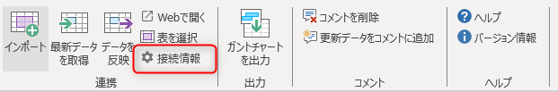 Excel で「TimeTracker NX」タブを選択し、下図赤枠の「接続情報」をクリックしてください。