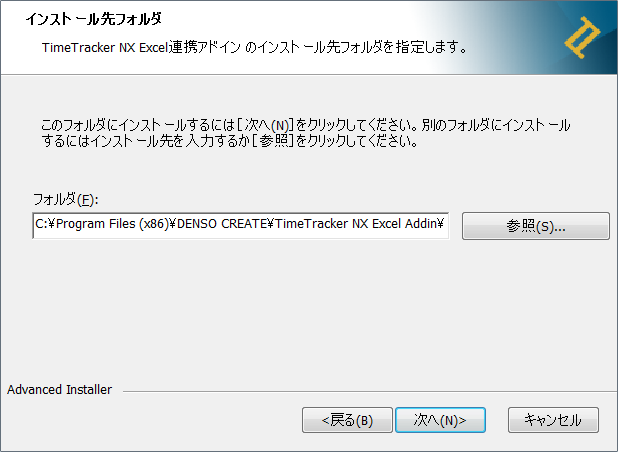 「インストール先フォルダ」の画面で、Excel連携アドインのインストール場所を指定して、「次へ」をクリックする。