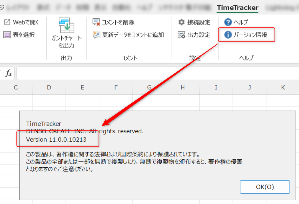 TimeTracker NX 7.1 で Excel連携アドインを利用する場合、下図のバージョンであることを確認してください。