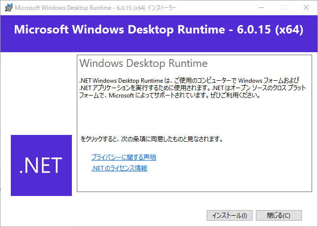 インストール先のPCに「Microsoft .NET Desktop Runtime」がインストールされていない場合、